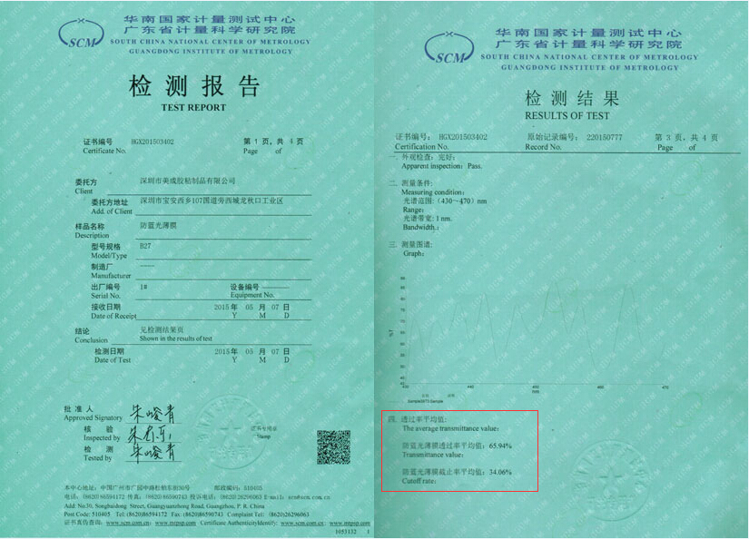 我們把真正具有抗藍光效果的薄膜貼合在鋼化玻璃上,經實際檢測是可以有效阻隔藍光30%的。